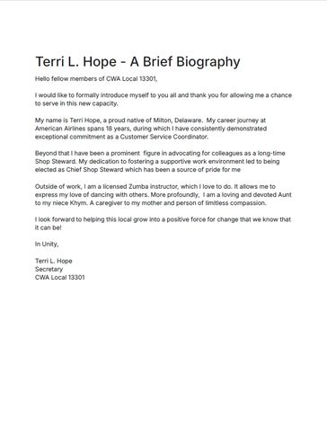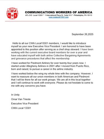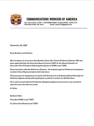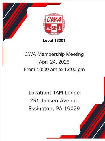 Welcome to CWA Local 13301. We are members of the CWA International, a union of 750,000 workers of which there are over 100,000 airline employees. Our local represents passenger service agents and customer service agents for both American Airlines and Piedmont Airlines. We cover PHL(Philadelphia), ABE(Allentown PA), AVP(Scranton PA), CRW